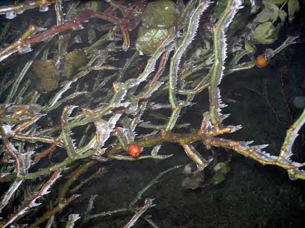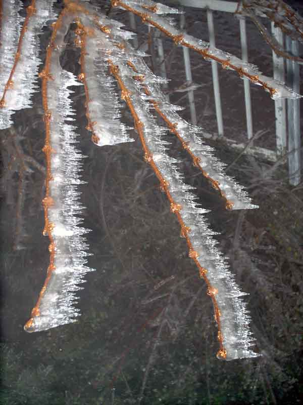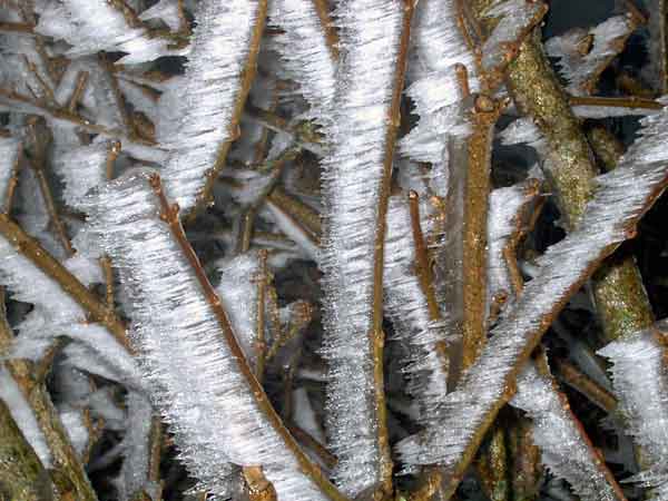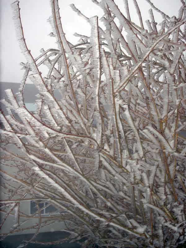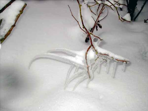Die Kälte führt zu Anblicken, in denen Büsche wie aus Glas wirken. Mit waagerechten Eiszapfen!